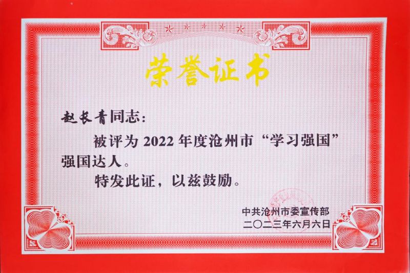 在“學(xué)習(xí)強國”滄州學(xué)習(xí)平臺上線兩周年之際,滄州市委宣傳部下發(fā)了關(guān)于評選全市“強國達人”的通知,在全市范圍內(nèi),以總學(xué)習(xí)積分為標(biāo)準(zhǔn)評選“強國達人”。截至5月20日,我公司共有30多名職工學(xué)習(xí)總積分和年度學(xué)習(xí)積分達到初評條件。最終,趙長青憑借總積分優(yōu)勢被評選為滄州市“強國達人”。