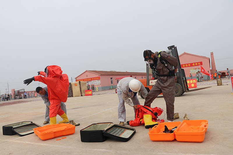本次參加實(shí)戰(zhàn)演練的隊(duì)員40余人�;顒�(dòng)模擬了機(jī)械傷害、中暑、觸電、火災(zāi)、溴素燙傷、氯氣泄露等6個(gè)事故場(chǎng)景。在應(yīng)急救援指揮部的統(tǒng)一指揮下和各應(yīng)急救援隊(duì)員的準(zhǔn)確處置下,人員得到了有效疏散,傷員得到了及時(shí)救助,事故得到有效控制,全面檢驗(yàn)了指揮調(diào)度效率和救援隊(duì)伍的應(yīng)急實(shí)戰(zhàn)水平,確保了遇到突發(fā)事件能“拉得出、攻得上、打得贏”。演練同時(shí)還進(jìn)行了消防技能、空呼機(jī)穿戴、防化服穿戴、空呼機(jī)穿戴30米跑等比武活動(dòng)。