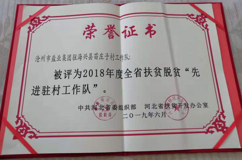 近日,滄州鹽業(yè)集團駐苗莊子村工作隊,被中共河北省委組織部、河北省扶貧開發(fā)辦公室授予2018年度全省扶貧脫貧“先進駐村工作隊”稱號。