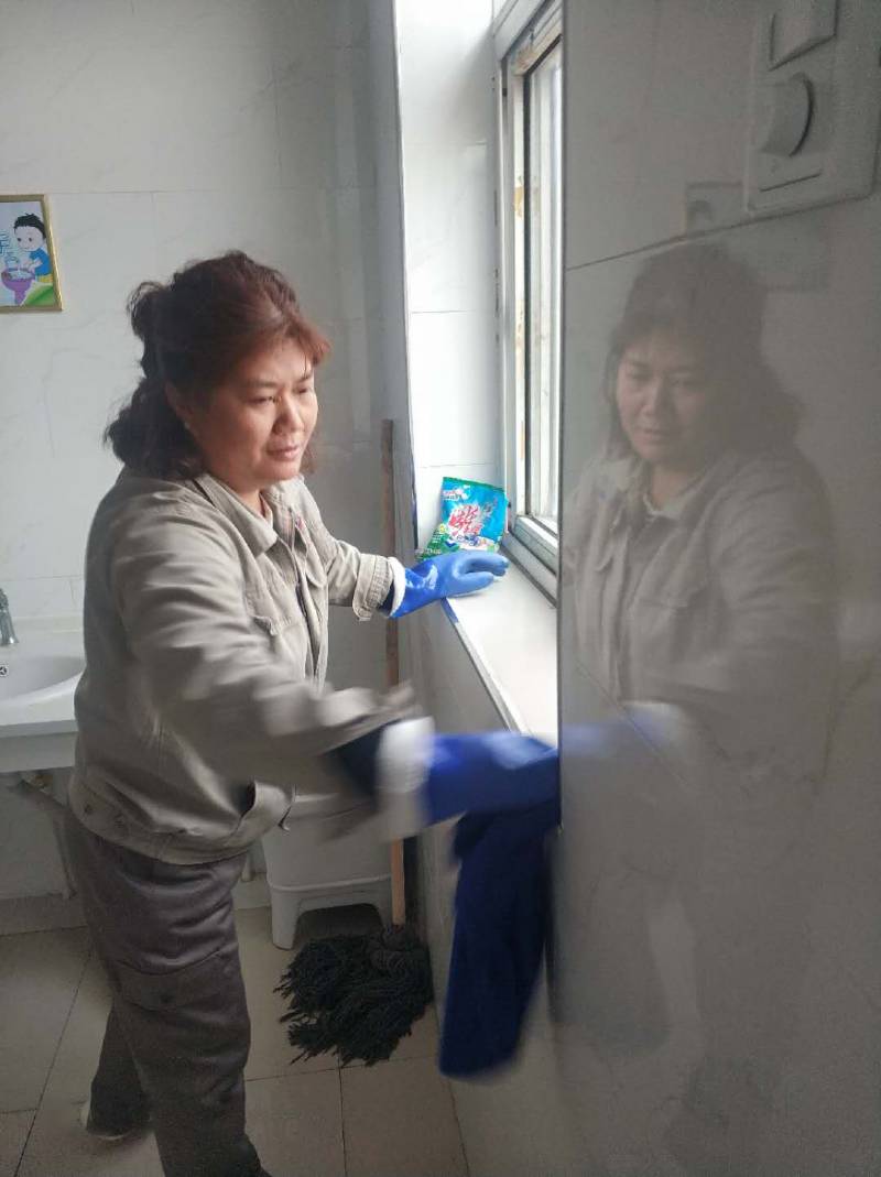 在職工陸續(xù)上崗時(shí),她又拿起笤帚打掃起宿舍、走廊來,并用投洗了幾遍的墩布,仔細(xì)地擦拭著房間里的犄角旮旯,直到地面上“照出人影來”才肯罷休。來不及歇息,她又緊接著趕赴下一個(gè)“戰(zhàn)場(chǎng)”——衛(wèi)生間。通風(fēng)、沖洗、消毒、清掃、擦拭、晾曬、整理,這一整套工作她只用30多分鐘就搞定了。