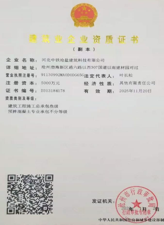 日前,河北中鐵滄鹽建筑科技有限公司經(jīng)過(guò)積極跑辦,如期取得了建筑工程施工總承包叁級(jí)和預(yù)拌混凝土專業(yè)承包不分等級(jí)兩個(gè)資質(zhì)。