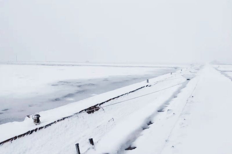 11月6日傍晚,降雨開始,制鹽一線各單元及時采取了片淡措施。至夜間,降雨和風力加大,陣風達到9級以上,氣溫降至零下,部分老化塑膜在低溫、狂風下出現(xiàn)破損。各制鹽隊組織職工連夜進行搶修,防止損失擴大。7日早晨,降雨轉(zhuǎn)為降雪,池內(nèi)塑膜被積雪覆蓋,一線職工冒著狂風暴雪進行片淡、除雪,并繼續(xù)對在狂風中受損的塑膜、線路進行搶修。雨雪中,長蘆公司領(lǐng)導帶領(lǐng)生產(chǎn)質(zhì)量部人員,趕往各個生產(chǎn)單元,隨時掌握災情,現(xiàn)場指揮抗災。