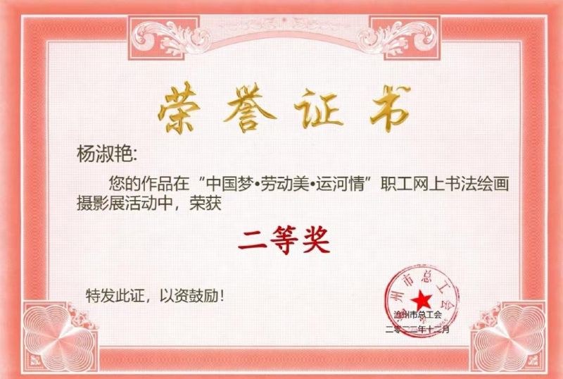 為了進一步營造喜迎二十大、建功新時代的濃厚氛圍,展現(xiàn)全市經(jīng)濟社會發(fā)展的新面貌、新成就,展示工會工作的新亮點、新成效,展現(xiàn)職工群眾的新風(fēng)采、新貢獻,進一步弘揚勞模精神、勞動精神、工匠精神,滄州市總工會開展了 “中國夢·勞動美·運河情”職工網(wǎng)上書法繪畫攝影展活動。