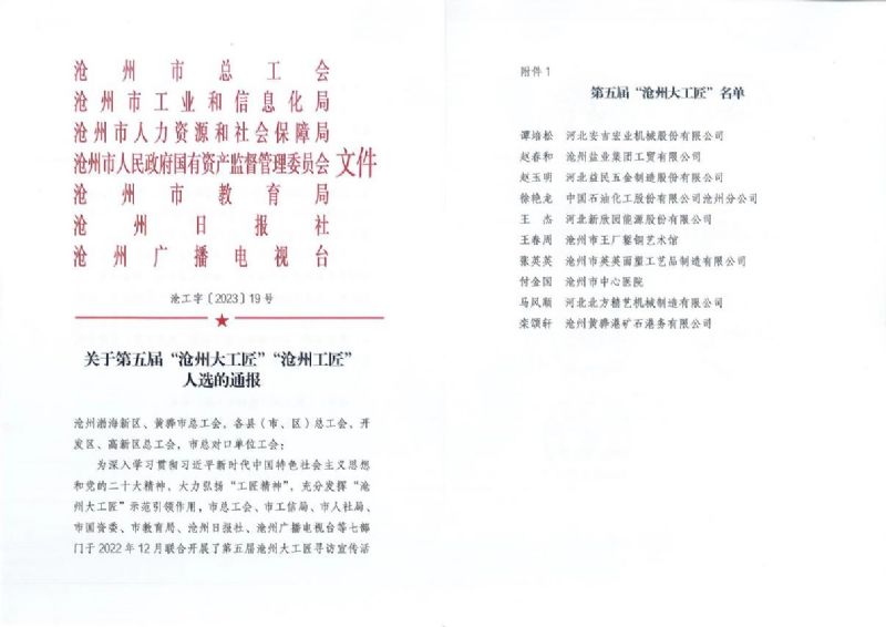 “滄州大工匠”是滄州市企業(yè)技能人才的至高榮譽(yù),評(píng)選活動(dòng)由市總工會(huì)、市工信局、市人社局、市國資委、市教育局、滄州日?qǐng)?bào)社、滄州廣播電視臺(tái)等七部門于 2022 年 12 月聯(lián)合開展,面向全市企業(yè)長期堅(jiān)守生產(chǎn)一線、從事技能工作的技工精英�;顒�(dòng)最終評(píng)選出滄州大工匠10名,滄州工匠10名。