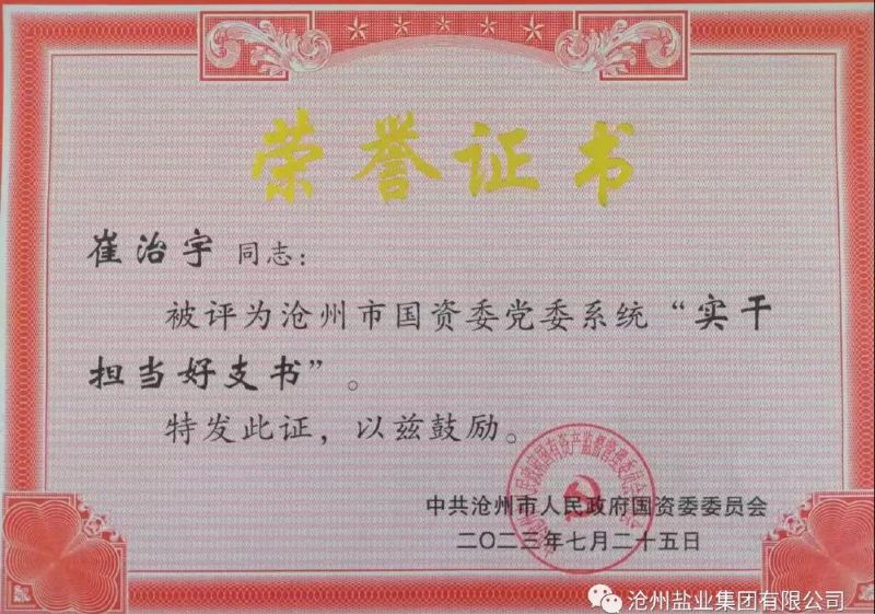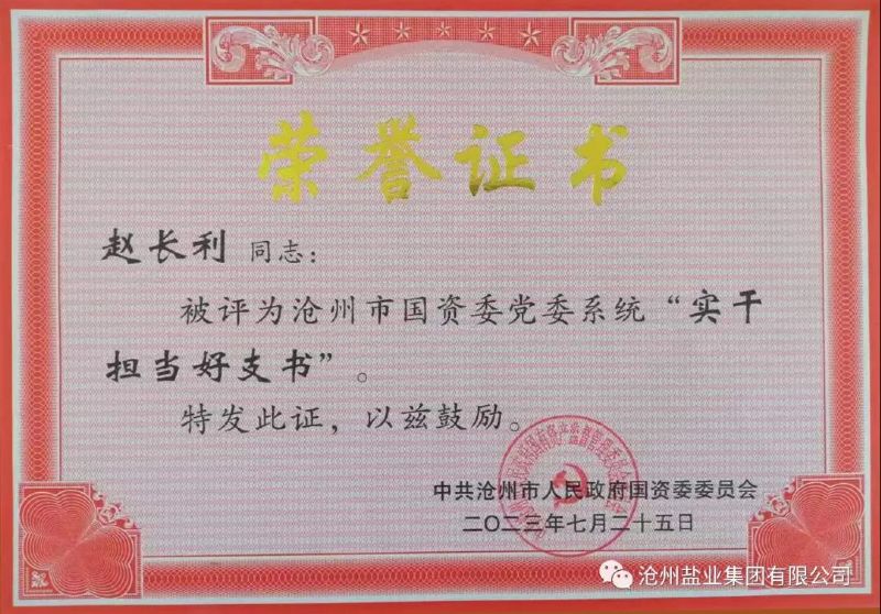 近日,我公司基層黨組織書記趙長利、崔治宇被中共滄州市人民政府國資委委員會授予“實干擔當好支書”稱號,并受到表彰。