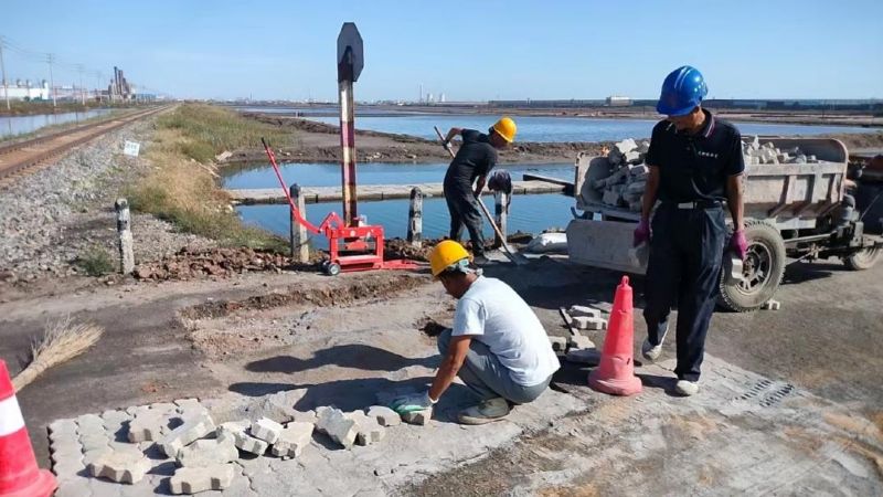 9月29日,建筑工程公司施工科職工早早來到施工現(xiàn)場,提前準(zhǔn)備好發(fā)電機(jī)、水泥、連鎖塊、沙子、石子等工具材料,通過對現(xiàn)場勘查,制定出修補(bǔ)辦法。按照修補(bǔ)方案,職工們開始了道路修補(bǔ)工程。修補(bǔ)施工現(xiàn)場,一派忙碌的景象,職工們有砌磚的、有拌灰的、有灌縫的,電鎬的沖擊聲、發(fā)電機(jī)的轟鳴聲與職工忙碌的身影交匯在一起,成為一道亮麗的風(fēng)景線。