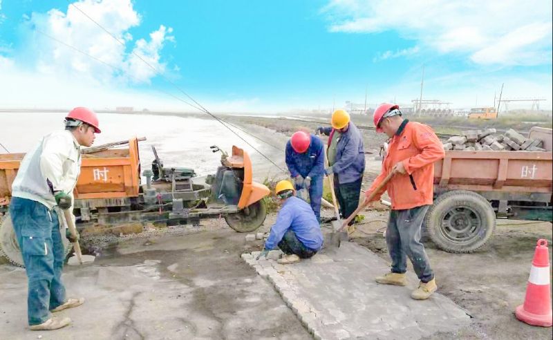 安全帽下,參與施工的建筑工程公司職工黝黑的皮膚反射著太陽的光芒,看著原本凸凹不平坑坑洼洼的路面變得平坦結(jié)實(shí),他們都露出了滿意的笑容。