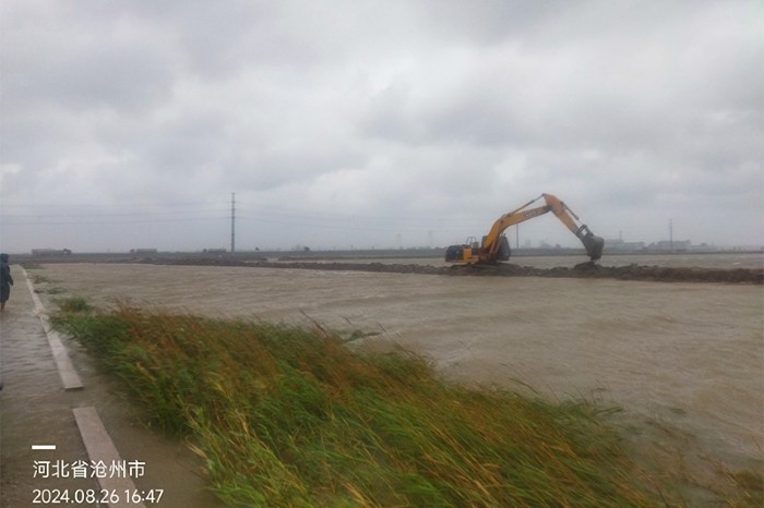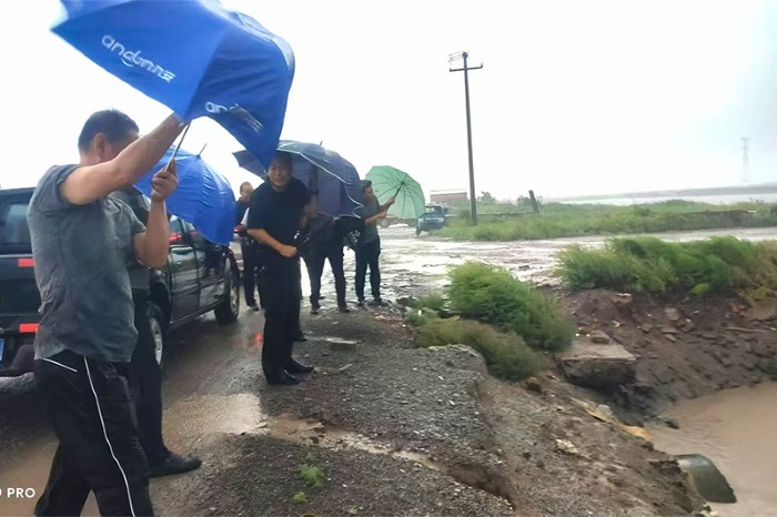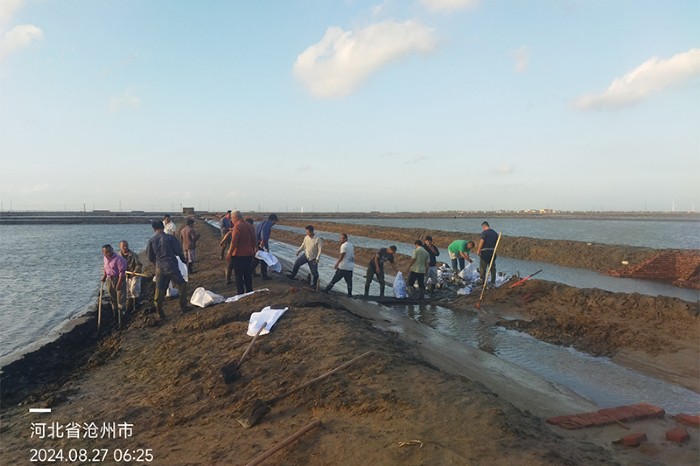 8月26日中午12點(diǎn)至下午5點(diǎn),疾風(fēng)驟雨襲擊廠區(qū),最大風(fēng)力持續(xù)達(dá)11級,幾個(gè)小時(shí)內(nèi)降雨量達(dá)150毫米以上,灘田內(nèi)波浪翻滾,猛烈沖擊著堤埝。渤海新區(qū)黃驊市氣象災(zāi)害防御指揮部將重大氣象災(zāi)害由二級應(yīng)急響應(yīng)提升為一級。集團(tuán)公司黨委副書記、總經(jīng)理張立莊率隊(duì)親臨生產(chǎn)一線督導(dǎo)防汛工作。