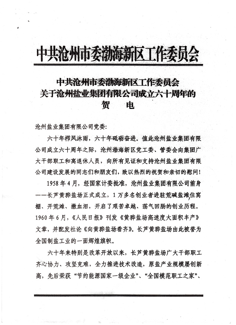 滄州渤海新區(qū)黨工委、管委會發(fā)來賀電,對公司成立六十周年表示祝賀,對公司過往取得的輝煌成就予以充分肯定,并寄望滄鹽集團繼續(xù)發(fā)揚滄鹽精神,深化改革,加快推進轉(zhuǎn)型升級,助力滄州渤海新區(qū)高質(zhì)量發(fā)展。